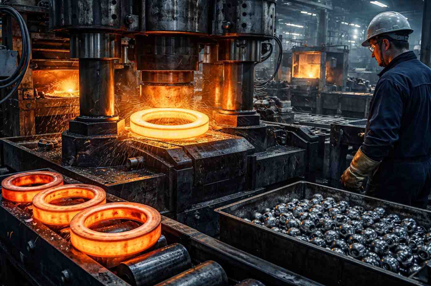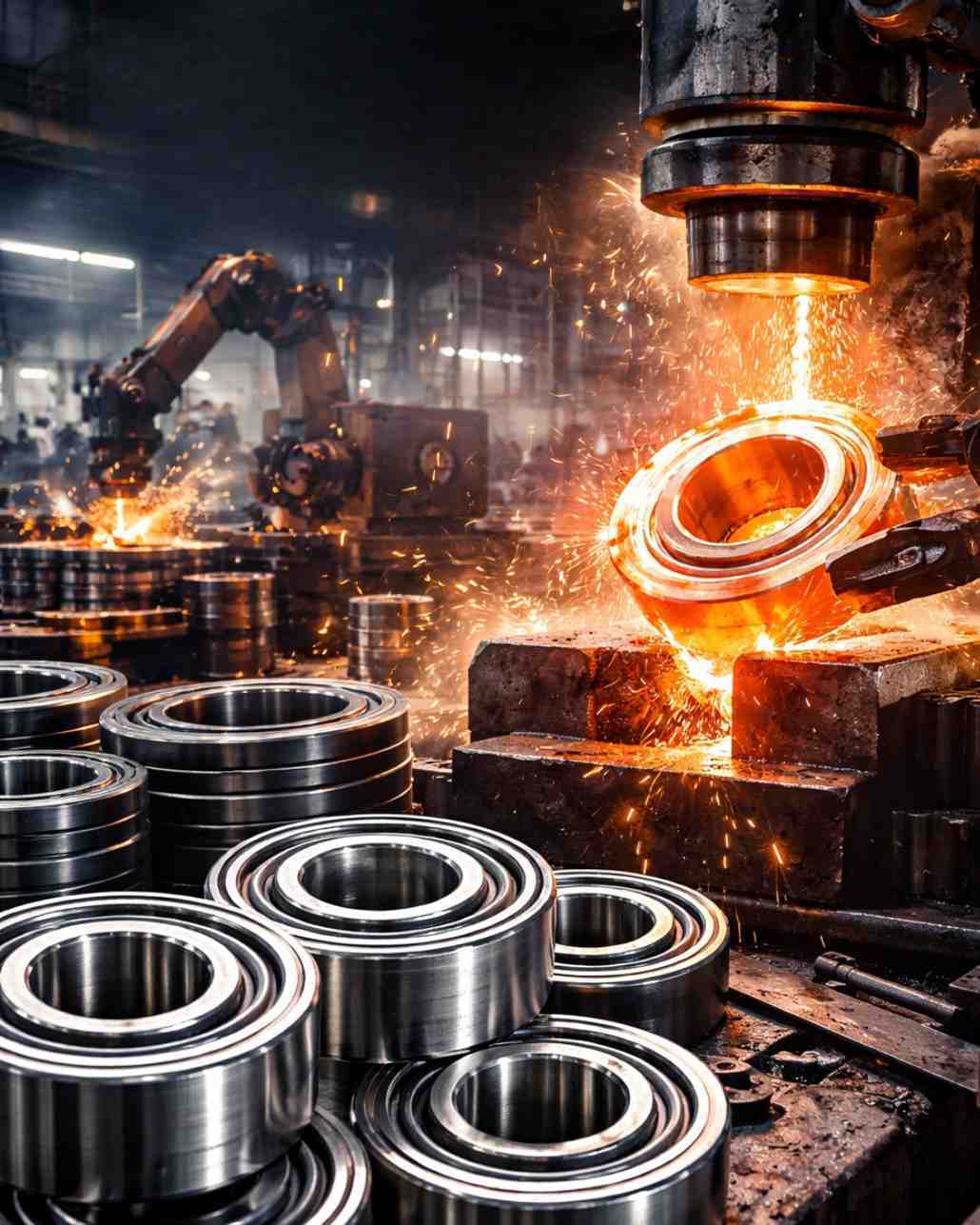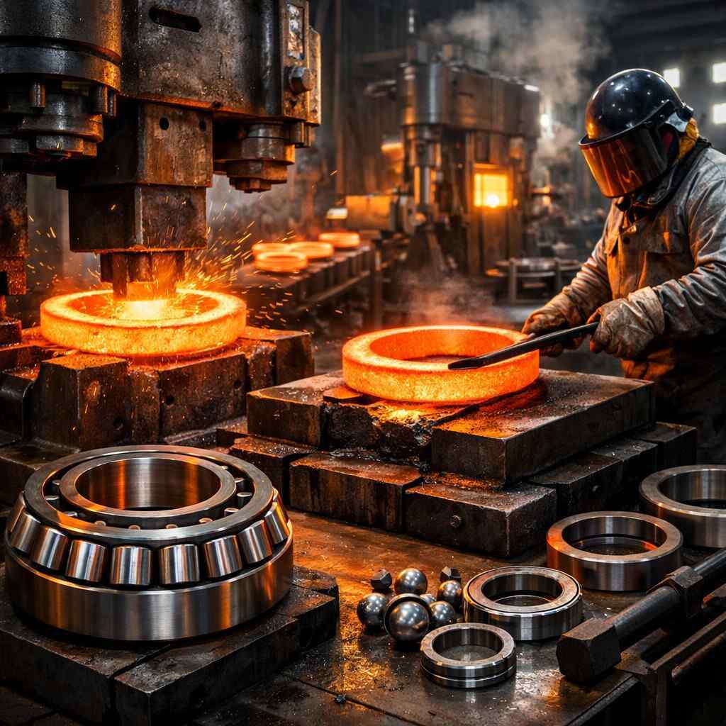 Blanks are forged into rings (inner and outer) using presses or rolling methods.